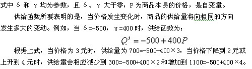 上述供给函数只表明了变量之间的一般关系,并没有说明它的性质和大小。为了提供定量信息,就要选用具体的函数形式。市场供给的线性形式,即线性的供给函数可以具体表示如下:
