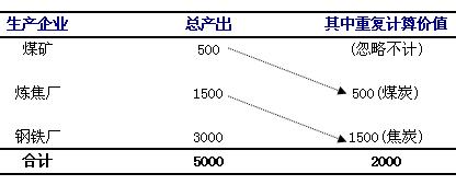 某煤矿某年采掘了价值500万元的煤炭,全部出售给炼焦厂;炼焦厂使用该煤炭做原材料,炼成价值1500万元的焦炭,将其出售给钢铁厂;钢铁厂使用该焦炭做为原材料,生产出价值为3000万元的钢材。容易看到,炼焦厂的1500万元的总产出中含有煤矿的50万元煤炭的价值,而钢铁厂的3000万元的总产出中又含在炼焦厂的1500万元焦炭的价值,此例中煤炭和焦炭都是中间产品。若将三个单位的总产出相加,得到5000万元,其中就包含了2000万元中间产品的重复计算(见表2-1)