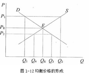 一种商品的均衡价格是指该种商品的需求量和供给量恰好相等,能够使市场出清的价格。它是在市场机制的自发作用下形成的。均衡价格的形成过程可以用图1―12来说明。