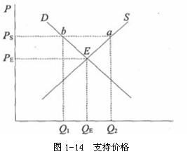 在图1―14中,PE为均衡价格,PS为支持价格,Q2-Q1为实行支持价格后的产品过剩的数量。从图1-14不难看出,如果需求曲线向右平移到a点,或供给曲线向左移动到b点,都会消除产品过剩。