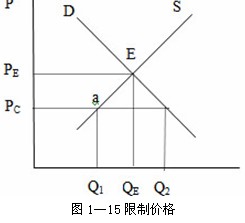 在图l―15中,PE为均衡价格,PC为限制价格,Q2-Q1为实行限制价格后产品短缺的数量。图1―15表明,如果采取限制需求的方法,使需求曲线向左平移到a点,产品的短缺状态就会被改变,当然,这时的市场均衡是一种被非市场力量所抑制的均衡。