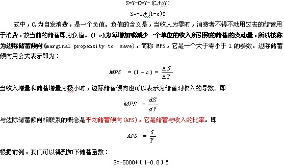 与消费函数相联系的概念是储蓄函数。由于Y=C+S,因此,同消费一样,储蓄也是收人的函数,可以一般地表示为S=f(Y)。如果将消费函数代入Y=C+S,经移项整理,就可以得到储蓄函数: