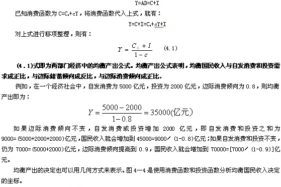 从上述分析可以看出,均衡产出的多少既取决于自发消费和投资需求的大小,也取决于边际消费倾向的高低。因此,当一个经济社会的实际产出不能实现充分就业时,增加国民收入,即实现较高的经济增长速度,不仅可以刺激消费和投资的增加,也可以提高家庭部门的边际消费倾向或降低边际储蓄倾向。反之,当经济出现过热,通货膨胀严重时,则可以通过抑制消费和投资以及降低边际消费倾向或提高边际储蓄倾向的方法抑制过快的经济增长速度。影响家庭部门消费水平、储蓄水平以及消费倾向、储蓄倾向的因素有很多,例如收人水平、利率水平、物价水平、社会分配的公平程度、社会保障水平、各国的文化传统以及消费信贷的条件和普遍程度等等。