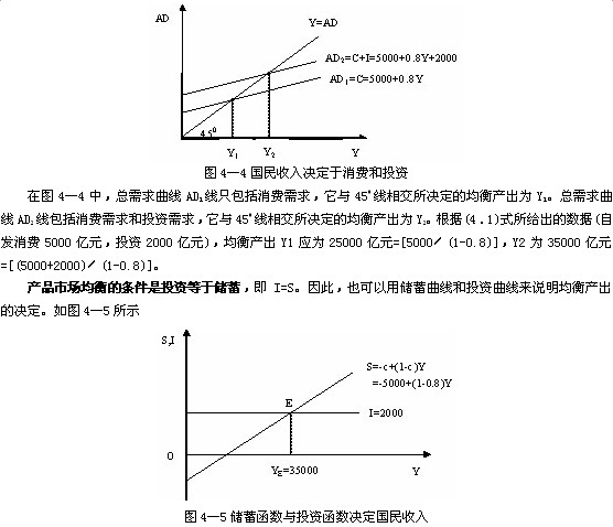 在图4―5中,假设投资是一个常数,与收入水平无关,因此是一条水平线。由于产品市场均衡的条件是I=S,因此,水平的投资曲线与斜率为正的储蓄曲线相交的E点即为产品市场的均衡点,与之相对应的YE即为均衡产出。当投资为2000亿元时,在产品市场均衡的条件下,储蓄也应为2000亿元。将S=2000代入储蓄函数S=-5000+(1-0.8)Y,就可以求出均衡产出为35000亿元。