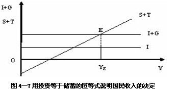 在图4―7中,支出都是一个常数,与收入水平无关,因此是一条水平线,即(I+G)线,它与投资曲线I线的垂直距离即为政府支出G。由于产品市场均衡的条件是:I+G=S+T,因此,水平的投资和政府支出曲线(I+G)与斜率为正的储蓄和税收曲线(S+T)相交的E点即为产品市场的均衡点,与之相对应的YE即为均衡产出。