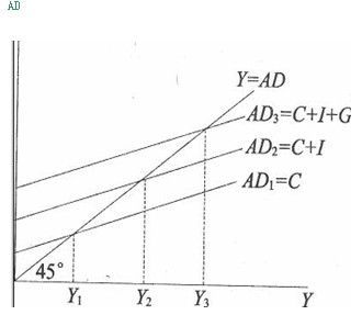 图4―6表明,政府支出的增加,使AD线从AD2线向上平移到了AD3线,均衡国民收入相应地从Y2增加到了Y3。