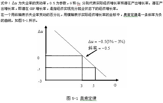 宏观经济政策目标的互补关系是指,政府对某一目标的追求或某一目标的实现,同时也能够促进其他目标的实现。例如,保持经济持续均衡增长的目标与实现充分就业目标之间,就存在着这种互补关系。这种互补关系表现在:从长期看,一国经济越是能够持续均衡地增长,就业率就越高,失业率就越低;反之亦然。从短期的经济波动来看,也是这样,当一国经济处在复苏和繁荣的景气上升时期,随着经济增长率的提高和经济总量的增加,就业机会随之增加;相反,当一国经济处在衰退和萧条的景气下降时期,随着经济规模的收缩,就业机会就会减少,失业率就会上升。经济增长与就业之间的高度相关关系,通常可以用奥肯定律或奥肯法则(Okun’s law)来说明。奥肯定律得一般表达方式是:实际GDP增长率每高于潜在GDP增长率1个百分点,失业率就会下降0.5个百分点。奥肯定律可以用下式表示: