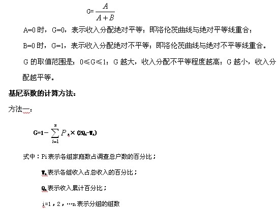 意大利经济学家基尼,根据洛伦茨曲线图计算出反映收入分配平等程度的指标―基尼系数。计算方法如下: