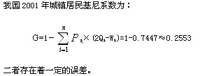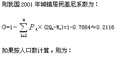 根据表2-4中的数据,计算各组家庭数占调查总户数的比重(Pi)、各组收入占总收入的比重(Wi)、各组收入占总收入的累计比重(Qi),在此基础上依方法一计算基尼系数。各项计算结果列在表2-5中。