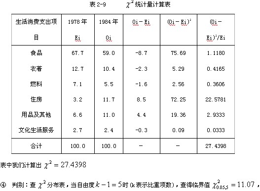 表2-8给我们的印象是,与改革开放前的1978年相比,我国农村居民1984年消费支出构成发生了一定的变化:食品、衣着、燃料、文化生活服务的支出所占比重有所下降,在表中第4列可以显示出来,为负值;住房和用品及其他比重有所提高,在表2-8中第4列中我们可以看到为正值。那么,能否认为消费支出构成的变化足以反映农村居民的生活质量在改革开放前后有了“质”的改变呢?要说明这样的问题,统计假设检验是一种较为理想的方法。