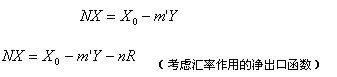 在净出口函数中,n是NX对R的敏感性,它表示汇率每变动一个百分点,净出口将会变动的数量。显然,净出口函数揭示了净出口与国民收入、实际汇率的内在联系。例如,假设净出口函数为