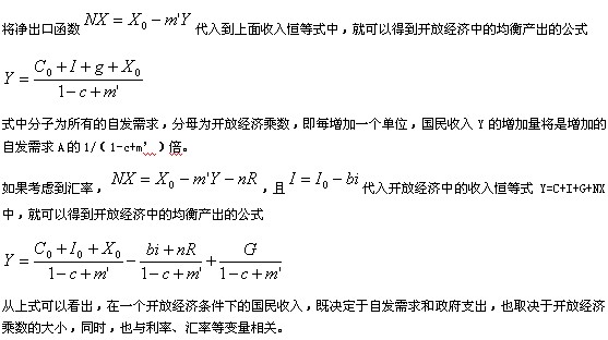 将对外贸易引入宏观经济运行后,国民收入不仅决定于消费需求C、投资需求I,和政府支出G,而且取决于净出口NX。这时,四部门经济即开放经济的收入恒等式即为Y=C+I+G+NX。由于NX是内生变量,有自己的函数形式,因此,我们可以将净出口函数引进开放经济中的收入恒等式。在收入恒等式中引入净出口函数后,会改变我们在第四章中得到的均衡产出公式和乘数公式。