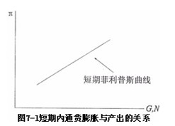 在图7―1中,纵轴表示通货膨胀率,横轴表示经济增长率(G)和就业率(N),坐标中斜率为正的曲线表示经济增长率与通货膨胀率之间的正相关关系,亦即产出水平与价格水平的正相关关系。由于就业率与经济增长率是正相关的,因此,坐标中的曲线也表示就业率与通货膨胀率之间的正相关关系。如果我们把图7―1坐标的横轴表示为失业率,就会得到一条斜率为负的曲线,这条斜率为负的曲线就是我们在第五章中给出的短期菲利普斯曲线。短期菲利普斯曲线所表示的是失业率与通货膨胀率之间的负相关关系。由于图7―1中斜率为正的曲线与第五章中的图5―2中斜率为负的曲线所表示的意思相同,因此,图7―1中斜率为正的曲线也称为短期菲利普斯曲线。