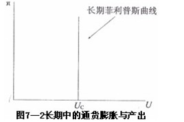 在图7―2的坐标中,纵轴表示通货膨胀率,横轴表示失业率,坐标中垂直于横轴的垂线被称为长期菲利普斯曲线。垂直的长期菲利普斯曲线表明,在长期中,无论价格水平怎样变动,失业率均为自然失业率()不变,如第三章和第五章所述,在只存在自然失业率的条件下即实现了充分就业的条件下所实现的产出水平实际上就是潜在的产出水平。因此,图7―2中的垂线不仅意味着自然失业率或充分就业的就业率与价格水平无关,也意味着潜在产出水平与价格水平无关。在长期中,潜在产出与价格水平之所以无关,是因为潜在产出水平取决于生产要素的投入数量和生产要素的效率,而不是取决于价格水平。