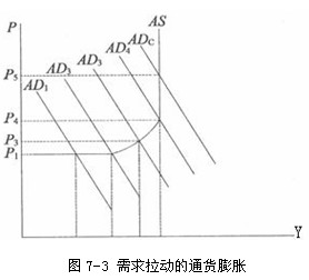 总需求的增加是否会导致通货膨胀,与总供给的状况有关。在一个经济社会没有实现充分就业即资源没有被充分利用之前,或者说供给弹性很大时,总需求的增加只能导致产出的增长而不会引起通货膨胀。当经济扩张到一定阶段,以致某些资源的供给变得相对不足时,总需求的进一步增加虽然还会刺激经济的进一步增长,但也会引发价格水平的小幅上升,从而出现英国经济学家凯恩斯所说的“半通货膨胀”或“爬行式通货膨胀”。当经济中的资源已经被充分利用即实现了充分就业以后,总需求的继续增加就会导致真正意义上的通货膨胀或完全的通货膨胀。这时,产出不再增加或增加很少,但价格水平则会急剧上升,这就是需求拉动的通货膨胀。需求拉动的通货膨胀可以见课本图7―3来。