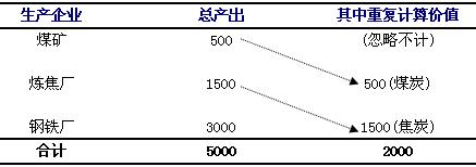 某煤矿某年采掘了价值500万元的煤炭,全部出售给炼焦厂;炼焦厂使用该煤炭做原材料,炼成价值1500万元的焦炭,将其出售给钢铁厂;钢铁厂使用该焦炭做为原材料,生产出价值为3000万元的钢材。容易看到,炼焦厂的1500万元的总产出中含有煤矿的50万元煤炭的价值,而钢铁厂的3000万元的总产出中又含在炼焦厂的1500万元焦炭的价值,此例中煤炭和焦炭都是中间产品。若将三个单位的总产出相加,得到5000万元,其中就包含了2000万元中间产品的重复计算(见表2-1)