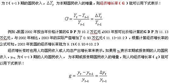(1)经济增长:就一般意义而言,经济增长是指一个国家或一个地区在一定时期内的总产出即国民收入与前期相比所实现的增长。总产出或国民收入通常用国内生产总值(GDP)来衡量。对一国经济增长速度度量,通常用经济增长率来表示。设Y为本期或报告期的国民收入,