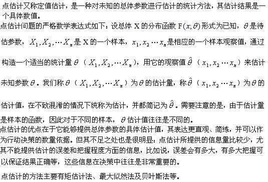 参数估计是本章讨论的问题。参数估计可表述为:在总体的分布函数或概率函数的数学表达式已知的情况下,通过对样本的实际观察取得样本数据,并在此基础上通过对样本统计量的计算得到总体待估参数的估计值来代替其真实的过程。参数估计包括点估计和区间估计。