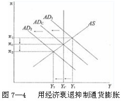 这是一项反需求拉动通货膨胀的经济政策。由于需求拉动通货膨胀的起因是过度需求,因此,只要抑制总需求,就可以达到抑制通货膨胀的目的。在政策上,政府可以通过实行紧缩性的财政政策和紧缩性的货币政策来实现。实行紧缩性的财政政策意味着要减少政府支出或增加税收,实行紧缩性的货币政策意味着应当抽紧银根,减少货币供给量,提高利率。实行紧缩性的财政政策和紧缩性的货币政策,会导致消费需求、投资需求、政府需求和来自国外的需求即净出口的减少,从而导致总需求的减少。在总供给水平不变的情况下,总需求的减少会导致价格水平的降低,从而对通货膨胀起到抑制作用。但这也会导致产出水平的下降,从而引起经济衰退。如图7―4所示。