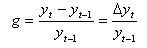 经济增长有时也用人均国民收入或人均总产出增长率来表示。如果用yt表示本期或报告期的人均国民收入,yt-1 为(t-1)期的人均国民收入, 为本期或报告期国民收入的增量,则人均经济增长率(g)就可以用下式表示: