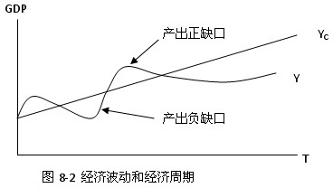 虽然一个国家在一个持续长的时期内都存在着一个相对稳定的长期经济增长趋势,但这并不排除实际经济运行在短期内会偏离这个趋势,有时,它可能在趋势线的上方运行,而在另外的时候,它又可能回到趋势线附近或跌到趋势线的下方。实际经济运行与长期经济增长趋势的偏离即为经济波动。并且,这种经济波动具有周期性,我们把周期性的经济波动称为经济周期,如图8-2所示。