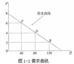 根据表1-1上的价格和需求量的各种组合,可以在一个纵轴代表价格,横轴代表需求量的平面坐标上绘制出一条斜率为负的需求曲线,见图1-1。