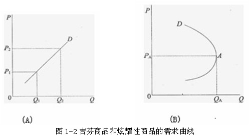 与吉芬商品不同,在图l―2(B)中的D线是向后弯曲的炫耀性商品的需求曲线。实际上,我们可以把这条需求曲线上斜率为零的A点作为分界点,将其分为两段。显然,A点以上的那半段需求曲线是符合需求法则的,因为它的斜率为负;而A点以下的那半段需求线是不符合需求法则的,因为它的斜率为正。斜率为正的需求曲线表明,商品的价格越高,需求量越大;反之,价格越低,需求量越小。