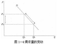 在图1―4中,当商品价格从Pa下降到Pb时,需求量从Qa增加到Qb,或沿着D线由a点移动到b点;当商品价格从Pb上升到Pa时,需求量便相应地从Qb减少到Qa,或沿着D线由a点移动到b点。