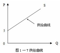 根据表l―2上的各种价格――供给量(P―Q)组合,可以在一个纵轴代表价格,横轴代表供给量的平面坐标上绘制一条供给曲线。见图1―7。