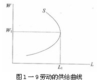 在生产要素市场上,劳动的供给曲线在一定的价格水平即工资水平(W)上也可能成为供给法则的例外。一般认为,劳动的供给曲线是一条向后弯曲的曲线。如图l一9所示。