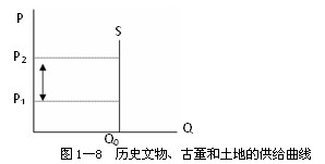 图1―8表明,历史文物、古董和土地的价格无论是上升至P2,还是下降到P1,其供给量都是不变的,都为Q0 。