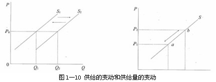 在图l―10(A)中,供给曲线由S1线移至S2线,从而引起了供给数量从Q1增加到 Q2,这意味着供给的增加;反之,当供给曲线由S2线移至S1线时,供给数量从Q2减少到 Q1,这意味着供给的减少。在图1―10(B)中,P―Q组合点从点a移至点b,这表示供给量增加;反之,从点b移至点a,则表示供给量减少。