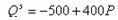 供给函数所要表明的是,当价格发生变化时,商品的供给量将向相同的方向发生多大的变动。例如,当δ=-500,γ=400时,供给函数为: