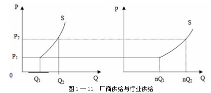 在图l一1l中,(A)图中的供给曲线为单个厂商的供给曲线,(B)图中的供给曲线为行业的供给曲线。在价格水平为P1时,单个厂商的供给量为Q1,则整个行业的供给量即为nQ1,当价格水平为P2时,单个厂商的供给量为Q2,则整个行业的供给量即为nQ2。依此类推,整个行业的供给曲线必定是该行业内所有厂商供给曲线的水平加总。