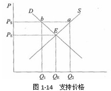 在图1―14中,PE为均衡价格,PS为支持价格,Q2-Q1为实行支持价格后的产品过剩的数量。从图1-14不难看出,如果需求曲线向右平移到a点,或供给曲线向左移动到b点,都会消除产品过剩。