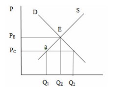 在图l―15中,PE为均衡价格,PC为限制价格,Q2-Q1为实行限制价格后产品短缺的数量。图1―15表明,如果采取限制需求的方法,使需求曲线向左平移到a点,产品的短缺状态就会被改变,当然,这时的市场均衡是一种被非市场力量所抑制的均衡。
