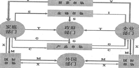 需要说明的是,图3―1的宏观经济循环流程图只代表一个社会经济运行的主流,大量的、非主流的经济运行均被略去。在宏观经济循环流程图中,连接各经济主体和市场的箭头均代表货币的流向和流量,产品和生产要素都是逆箭头方向运动的。图中的字母的含义,在下文中将分别给以说明。