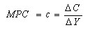 式中,C0是一个大于零的常数,是由其他因素决定的不依赖于收入的消费,即收入为零时的消费水平,称为自发消费或自主消费,c为每增加或减少一个单位的收人所引致的消费变动量,所以被称为边际消费倾向(marginal propensity t0 consume),简称MPC。通常,它是一个大于零小于l的参数。用公式表示即为: