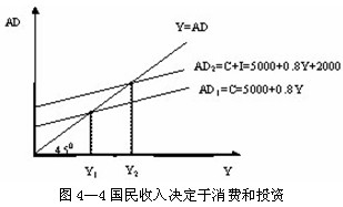 在图4―4中,总需求曲线AD1线只包括消费需求,它与450线相交所决定的均衡产出为Y1。总需求曲线AD2线包括消费需求和投资需求,它与450线相交所决定的均衡产出为Y2。根据(4.1)式所给出的数据(自发消费5000亿元,投资2000亿元),均衡产出Y1应为25000亿元=[5000/(1-0.8)],Y2为35000亿元=[(5000+2000)/(1-0.8)]。