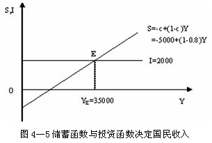 在图4―5中,假设投资是一个常数,与收入水平无关,因此是一条水平线。由于产品市场均衡的条件是I=S,因此,水平的投资曲线与斜率为正的储蓄曲线相交的E点即为产品市场的均衡点,与之相对应的YE即为均衡产出。当投资为2000亿元时,在产品市场均衡的条件下,储蓄也应为2000亿元。将S=2000代入储蓄函数S=-5000+(1-0.8)Y,就可以求出均衡产出为35000亿元。