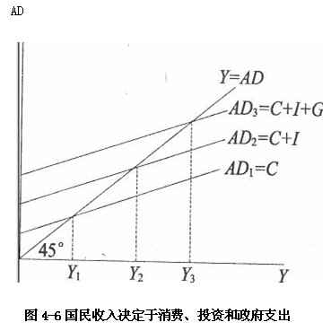 图4―6表明,政府支出的增加,使AD线从AD2线向上平移到了AD3线,均衡国民收入相应地从Y2增加到了Y3。