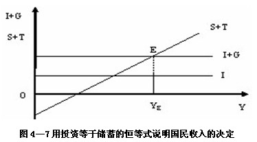 在图4―7中,支出都是一个常数,与收入水平无关,因此是一条水平线,即(I+G)线,它与投资曲线I线的垂直距离即为政府支出G。由于产品市场均衡的条件是:I+G=S+T,因此,水平的投资和政府支出曲线(I+G)与斜率为正的储蓄和税收曲线(S+T)相交的E点即为产品市场的均衡点,与之相对应的YE即为均衡产出。