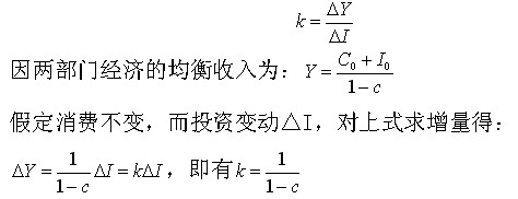 投资乘数k是指国民收入变动对引起这种变动的投资变动的比率,即变动一个单位的投资所导致的国民收入变动的倍数。即