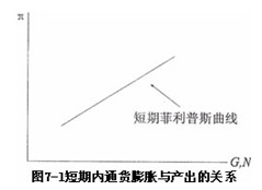 在图7―1中,纵轴表示通货膨胀率,横轴表示经济增长率(G)和就业率(N),坐标中斜率为正的曲线表示经济增长率与通货膨胀率之间的正相关关系,亦即产出水平与价格水平的正相关关系。由于就业率与经济增长率是正相关的,因此,坐标中的曲线也表示就业率与通货膨胀率之间的正相关关系。如果我们把图7―1坐标的横轴表示为失业率,就会得到一条斜率为负的曲线,这条斜率为负的曲线就是我们在第五章中给出的短期菲利普斯曲线。短期菲利普斯曲线所表示的是失业率与通货膨胀率之间的负相关关系。