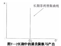 被称为长期菲利普斯曲线。垂直的长期菲利普斯曲线表明,在长期中,无论价格水平怎样变动,失业率均为自然失业率()不变,如第三章和第五章所述,在只存在自然失业率的条件下即实现了充分就业的条件下所实现的产出水平实际上就是潜在的产出水平。因此,图7―2中的垂线不仅意味着自然失业率或充分就业的就业率与价格水平无关,也意味着潜在产出水平与价格水平无关。在长期中,潜在产出与价格水平之所以无关,是因为潜在产出水平取决于生产要素的投入数量和生产要素的效率,而不是取决于价格水平。