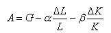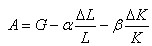 设经济增长率为G,劳动增长率为ΔL/L,资本增长率为ΔK/K,技术进步率为A,则有下列关系式: