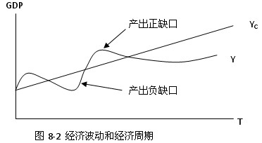 图中纵轴表示产出水平,横轴表示以年为单位的时间。坐标中的曲线(Y线)即为实际经济运行曲线,曲线上的任意一点都表示一个国家在某一时期的实际总产出,Yc线为长期经济增长趋势线,线上任意一点都表示一个国家在一定时期的潜在产出水平。当实际产出水平高于潜在产出水平时,经济中存在着一个产出正缺口,而当实际产出水平低于潜在产出水平时,经济中则存在着一个产出负缺口。