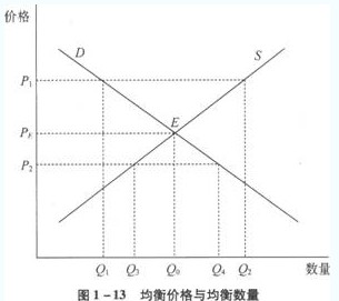由图1―13可以看到,如果商品的价格水平较高,如P1,则需求量Q0<供给量Q1,此时市场上商品过剩,则卖方之间会出现竞争,从而导致价格下降。反之,如果商品的价格水平较低,如P2,则需求量Q4>供给量Q3,此时市场上商品短缺,则买方之间会出现竞争,从而导致价格上升。价格、供求和竞争之间的这种内在联系即为市场机制。如果市场是完全竞争的市场,在市场机制的作用下,供给和需求会最终稳定在E点,此时商品既不过剩,也不短缺,达到均衡状态。