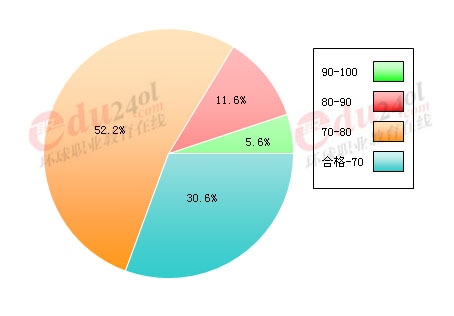 2008年职称日语全国的合格标准是60分,部分省市和地区根据自当地的情况有适当的降分。环球网校该科目已通过学员考试成绩分布为:合格―70分占30.6%;71-80分占52.2%;81-90占11.6%;91-100分为5.6%。 具体分布如下图所示: