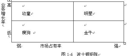 波士顿矩阵根据市场增长率和市场份额两项指标,将企业分为“明星”、“金牛”、“瘦狗”和“幼童”。